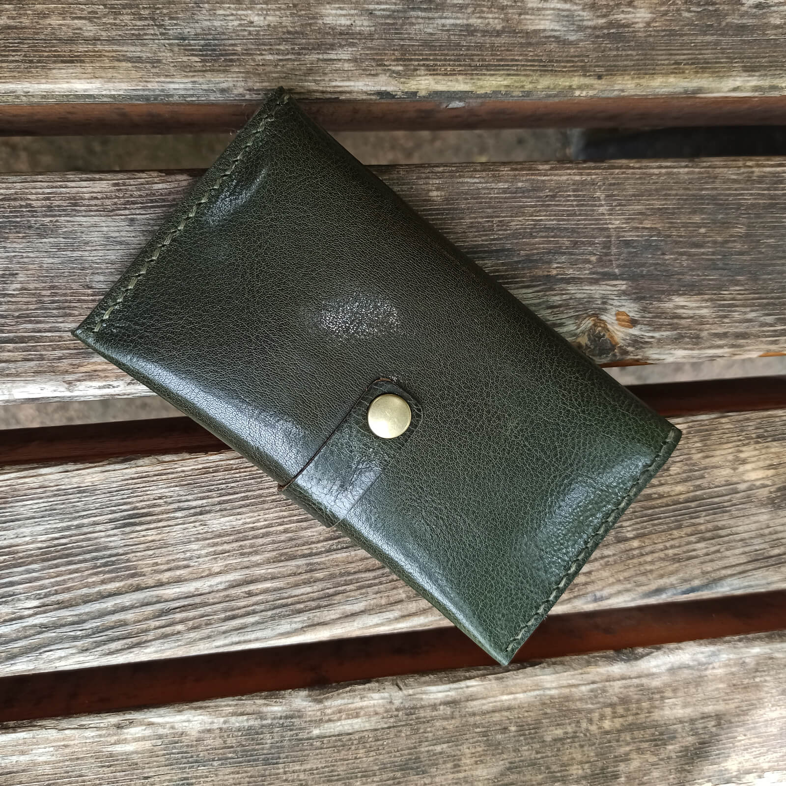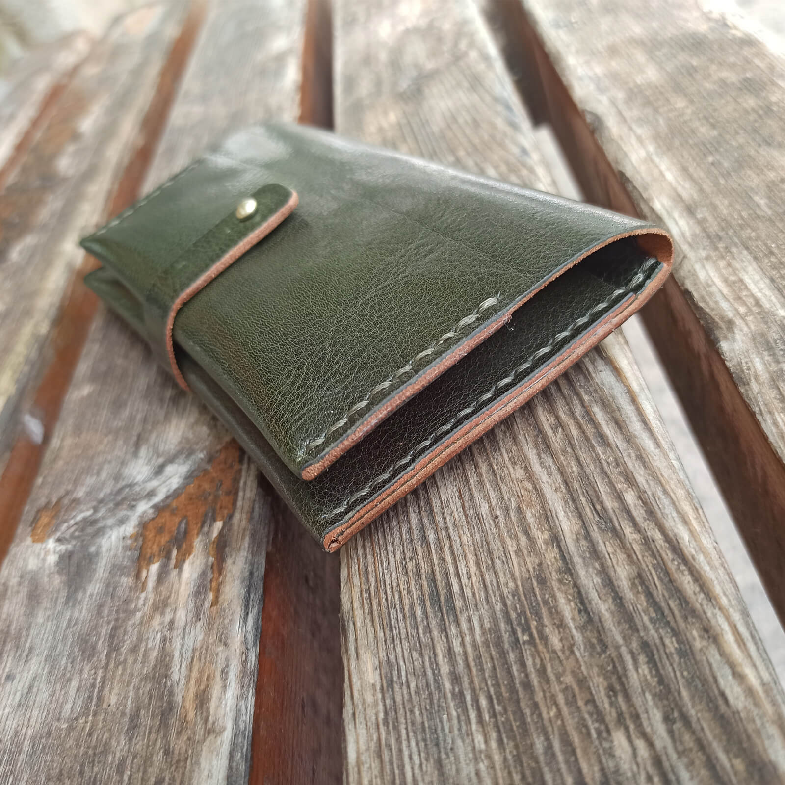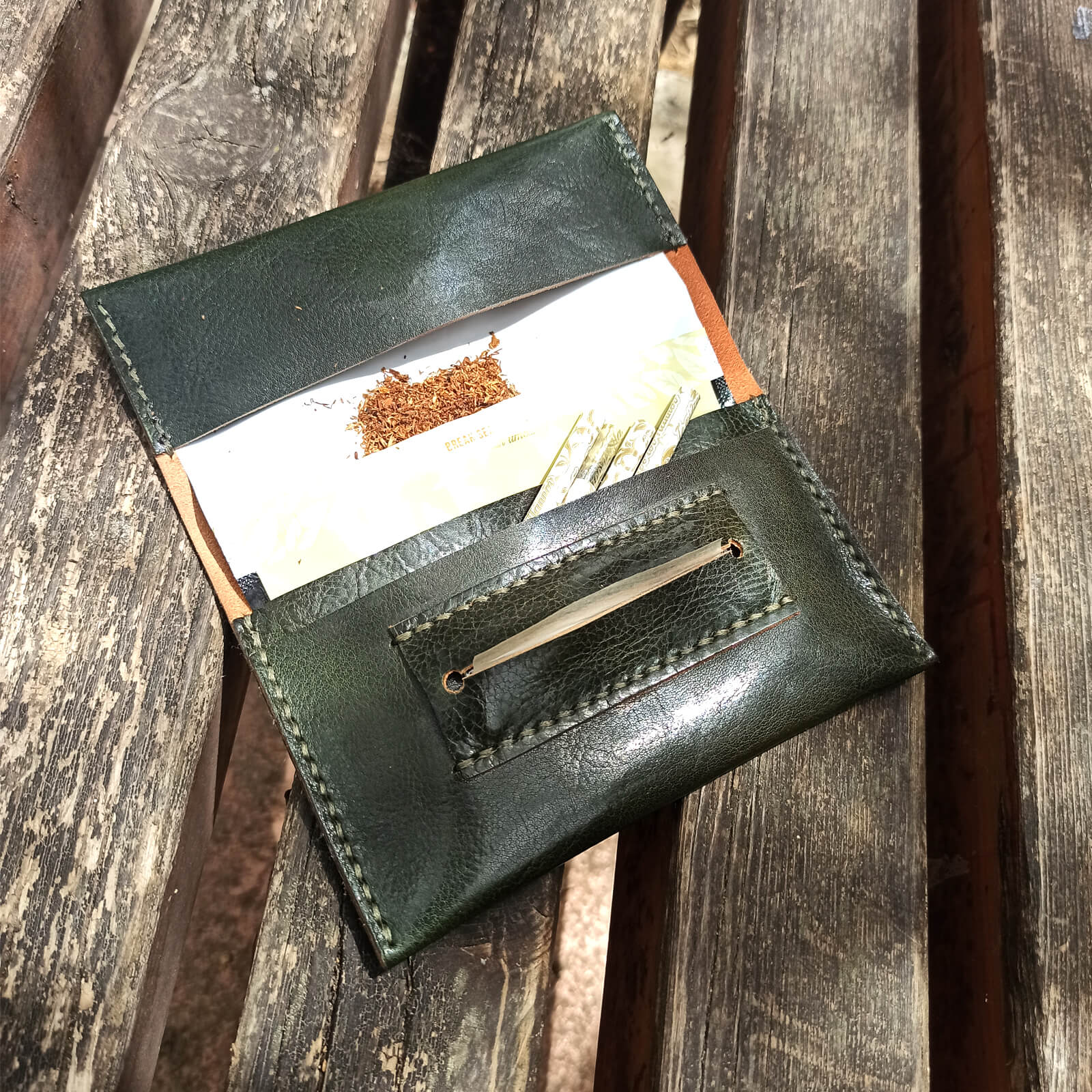 Χειροποίητη δερμάτινη καπνοθήκη με κουμπί κλεισίματος, φτιαγμένη από ιτατικό δέρμα υψηλής ποιότητας.