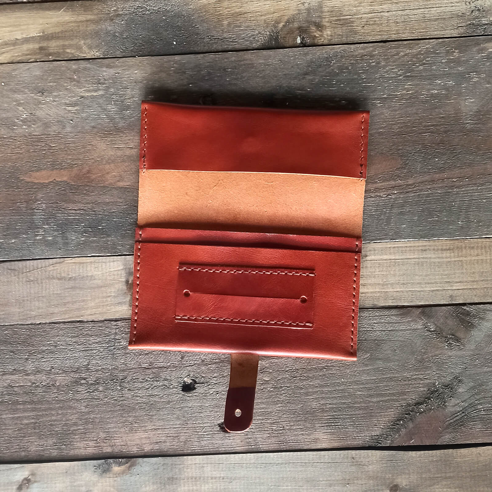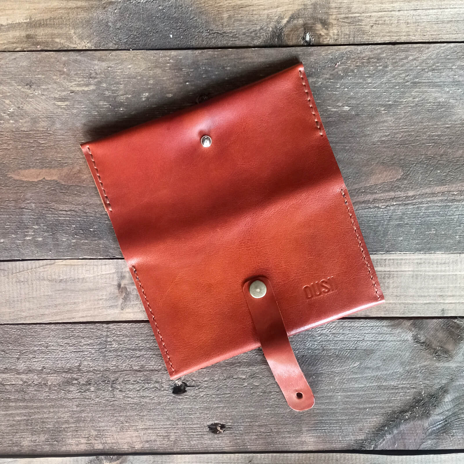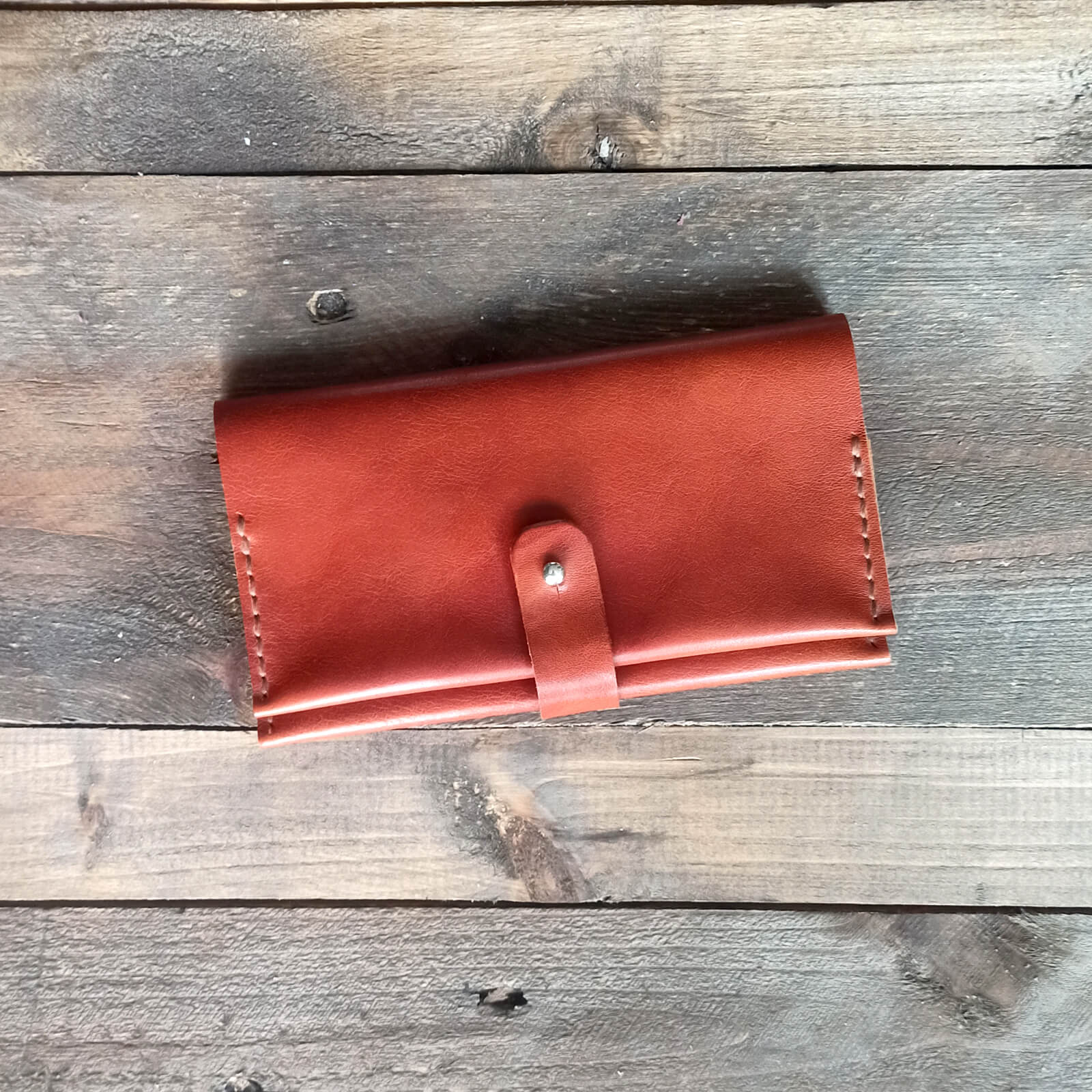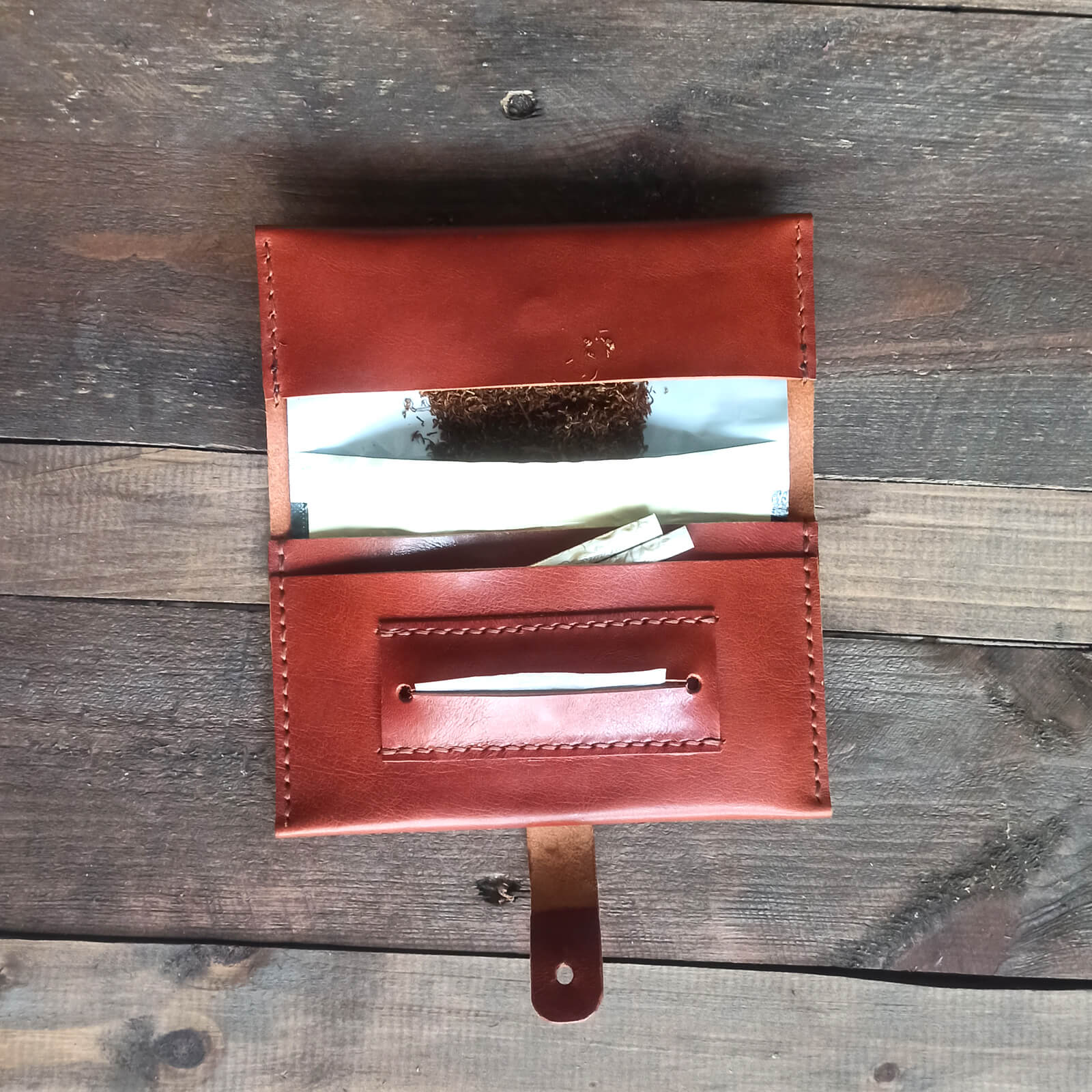 Χειροποίητη δερμάτινη καπνοθήκη με κουμπί κλεισίματος, φτιαγμένη από ιτατικό δέρμα υψηλής ποιότητας.