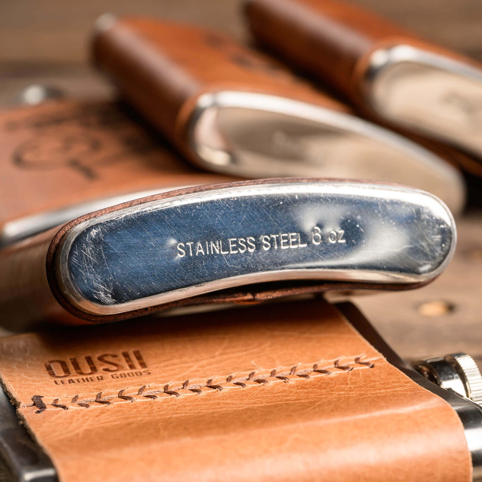 Φλασκί ανοξείδωτο 6oz - με επένδυση από δέρμα & προσωποποιημένη χάραξη. Κάθε τεμάχιο είναι μια μικρή χειροτεχνία, ιδανική για να φιλοξενήσει το αγαπημένο σας ποτό.