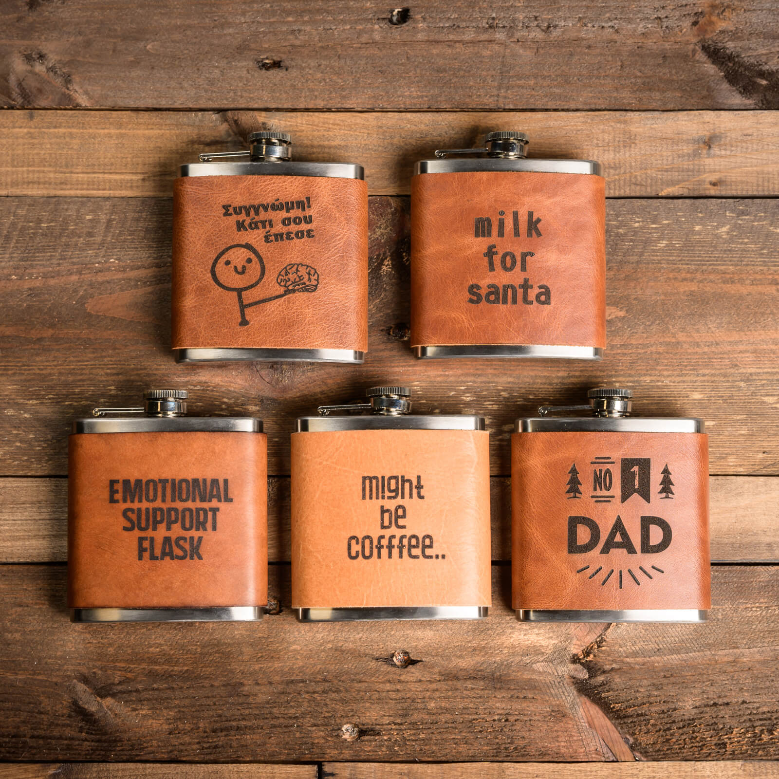 Φλασκί ανοξείδωτο 6oz - με επένδυση από δέρμα & προσωποποιημένη χάραξη. Κάθε τεμάχιο είναι μια μικρή χειροτεχνία, ιδανική για να φιλοξενήσει το αγαπημένο σας ποτό.