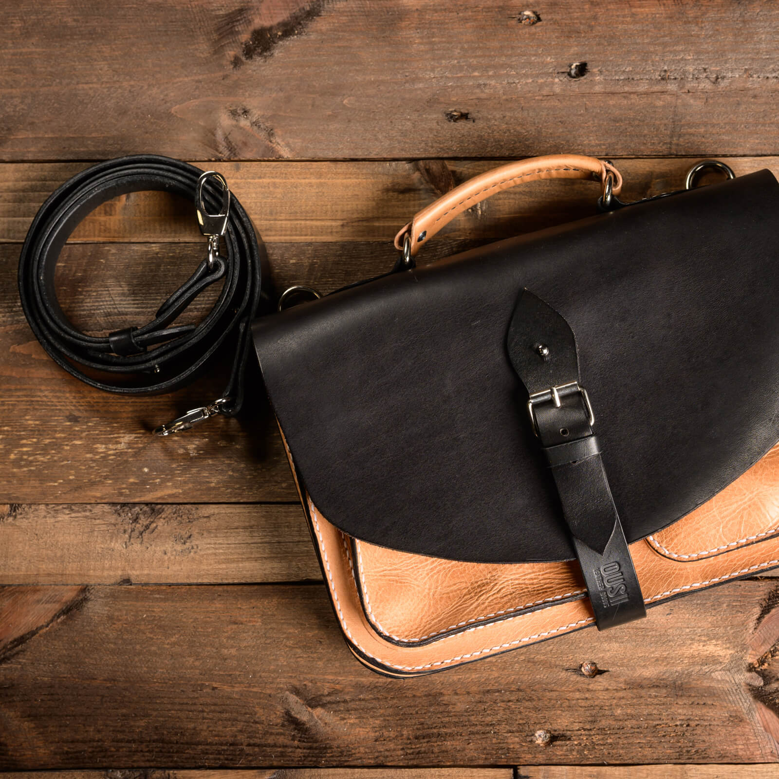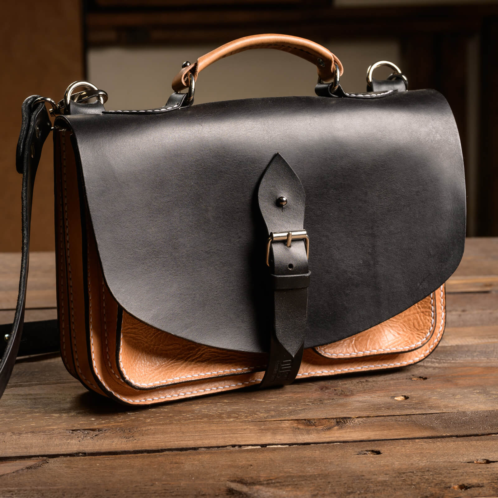 Vintage Χειροποίητη Δερμάτινη Τσάντα Χειρός / Ώμου – Messenger Bag (Μαύρο & Ταμπά). Μοναδικό Στυλ και Χειροποίητη Τέχνη.